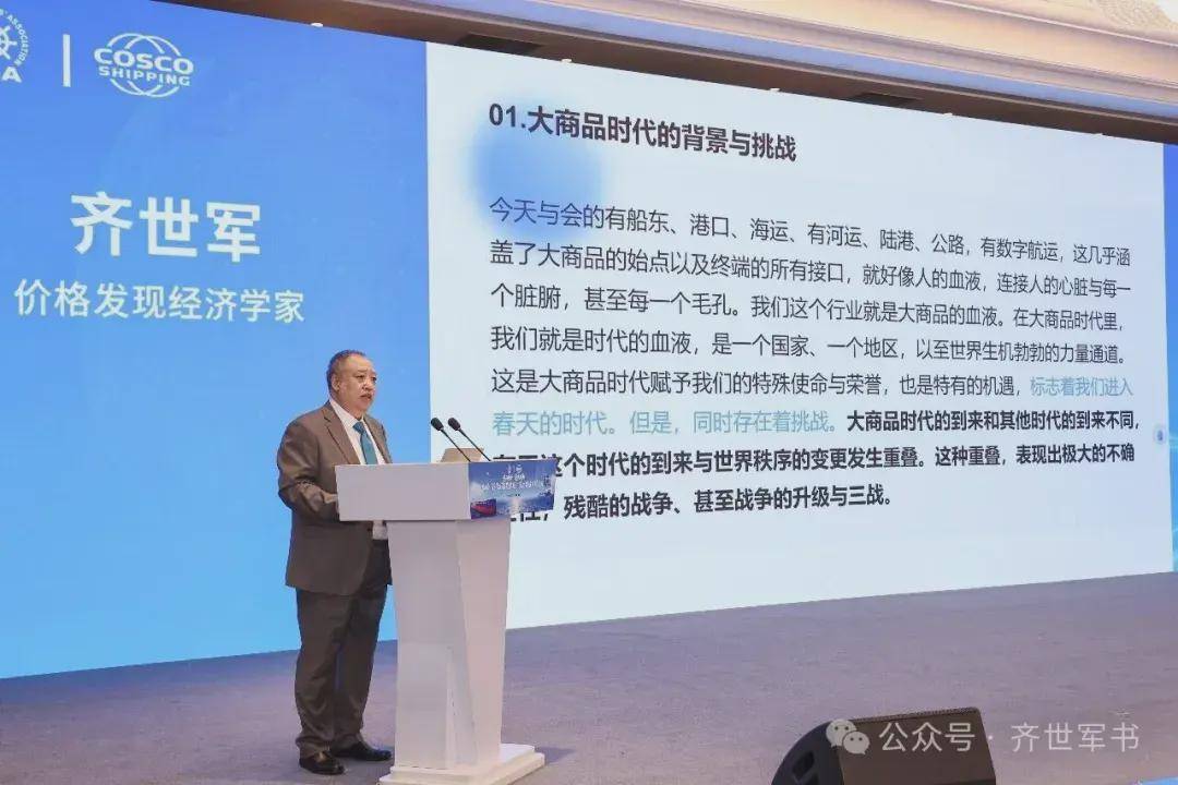 今天与会的有船东、港口、海运、有河运、陆港、公路,有数字航运,这几乎涵盖了大商品的始点以及终端的所有接口,就好像人的血液,连接人的心脏与每一个脏腑,甚至每一个毛孔。我们这个行业就是大商品的血液。在大商品时代里,我们就是时代的血液,是一个国家、一个地区,以至世界生机勃勃的力量通道。这是大商品时代赋予我们的特殊使命与荣誉,也是特有的机遇,标志着我们进入春天的时代。但是,同时存在着挑战。大商品时代的到来和其他时代的不同,在于这个时代的到来与世界秩序的变更发生重叠。这种重叠,表现出极大的不确定性,残酷的战争、甚至战争的升级与三战。