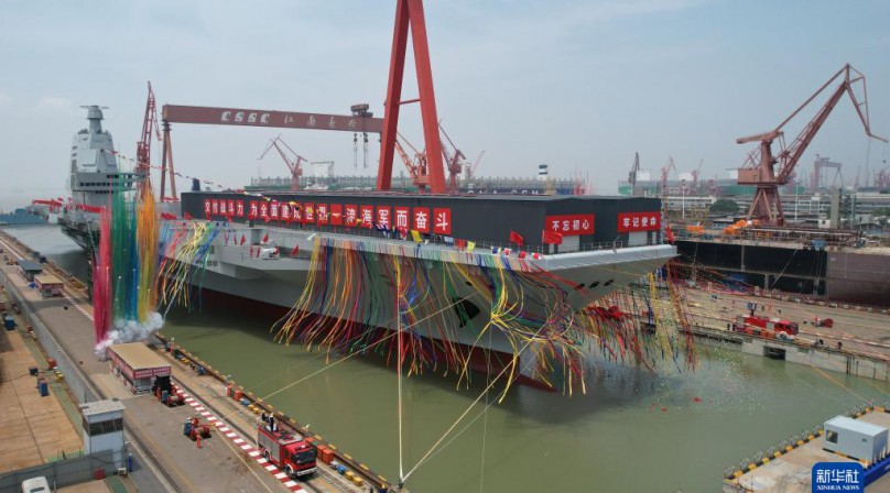 我国第三艘航空母舰下水命名 许其亮出席下水命名仪式