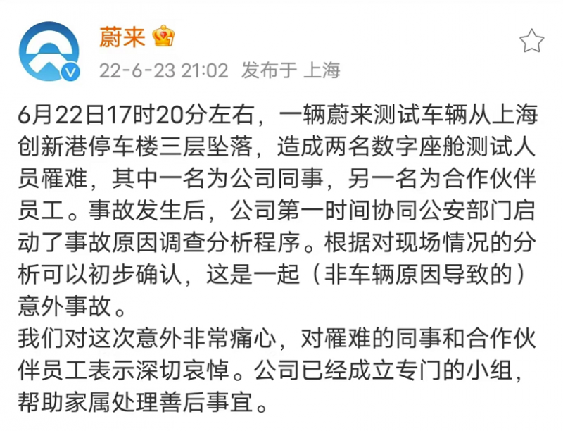 蔚来汽车表示,6月22日17时20分左右,一辆蔚来测试车辆从上海创新港停车楼三层坠落,造成两名数字座舱测试人员罹难,其中一名为公司同事,另一名为合作伙伴员工。事故发生后,公司第一时间协同公安部门启动了事故原因调查分析程序。根据对现场情况的分析可以初步确认,这是一起(非车辆原因导致的)意外事故。