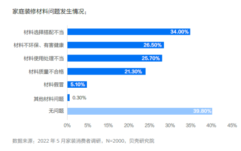 报告显示,有超过六成的家装消费者曾遇到过材料问题,其中既有涉及材料本身的问题,例如材料不环保有害健康(26.5%)、材料质量不合格(21.3%)、以及材料假冒(5.1%);也有涉及材料使用的问题,例如材料选择搭配不当(34%)、材料使用处理不当(25.7%)等。