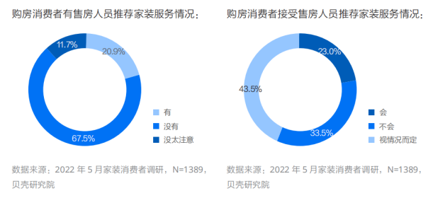 中介推荐装修服务情况(左图)与消费者接受度(右图)。