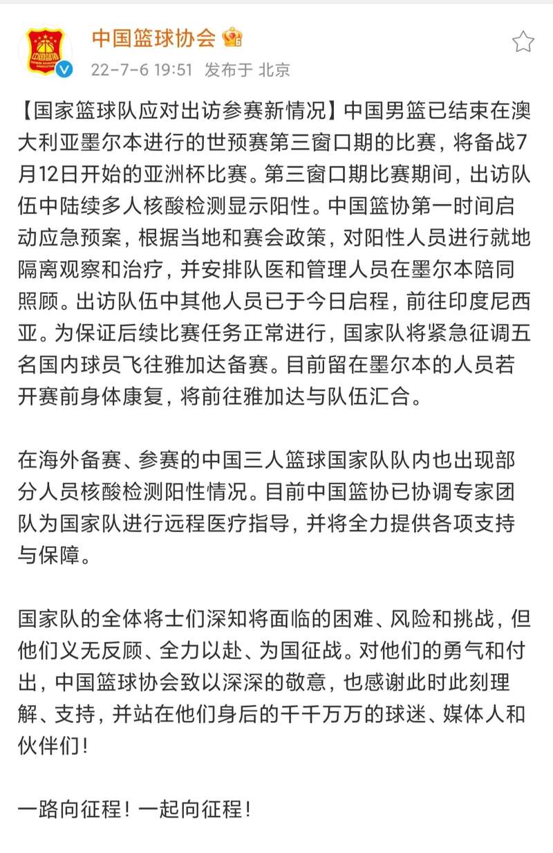 中国青年报客户端北京7月6日电(中青报·中青网记者杨屾)经中国篮协确认,正在国外征战的中国男篮多人核酸阳性,为完成接下来征战男篮亚洲杯的任务,中国篮协已经紧急征调多人前往雅加达。