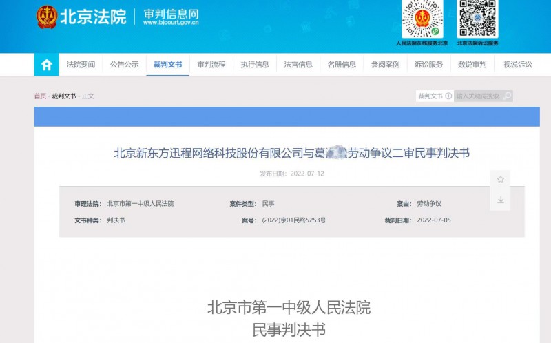 7月12日,北京法院审判信息网公开北京新东方迅程网络科技股份有限公司与葛某劳动争议二审民事判决书。审理法院为北京市第一中级人民法院,判决结果为新东方迅程公司支付葛某违法解除劳动合同赔偿金38.25万元。
