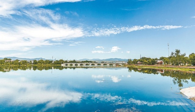 7月18日,卢沟桥畔晓月湖平静的湖面像面镜子,倒映出蓝天白云,呈现出一幅“天空之镜”的美景。人们漫步永定河畔,仿佛徜徉在灵动的画卷之间。