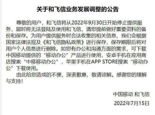 尊敬的用户,和飞信将从2022年9月30日开始停止提供服务,届时将无法登陆及使用和飞信,请您提前做好重要资料的备份和保存。为用户提供服务时合法收集的相关信息,我们会根据国家法律法规及《和飞信隐私政策》进行保存,保存期限后将对用户个人信息进行删除。