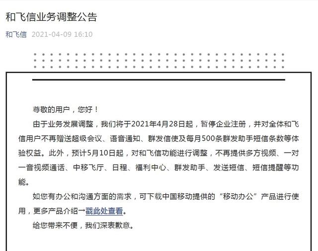 需要提及的是,和飞信去年4月底曾发布业务调整公告。公告称,由于业务发展调整,将于2021年4月28日起,暂停企业注册,并对全体和飞信用户不再赠送超级会议、语音通知、群发信使及每月500条群发助手短信条数等体验权益。此外,预计5月10日起,对和飞信功能进行调整,不再提供多方视频、一对一音视频通话、中移飞厅、日程、福利中心、群发助手、发送短信、短信提醒等功能。