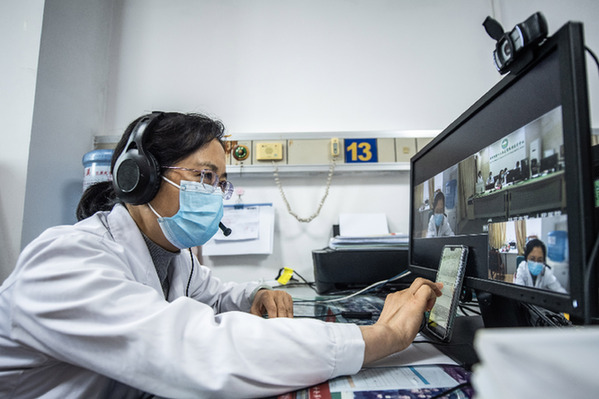 贵州省人民医院专家在和毕节市第一人民医院医生进行远程医疗会诊。新华社记者 陶亮 摄