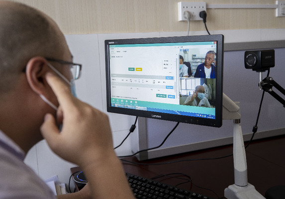 宁夏盐池县中医院医生在与王乐井乡曾记畔村卫生所进行远程诊疗。新华社记者 杨植森 摄