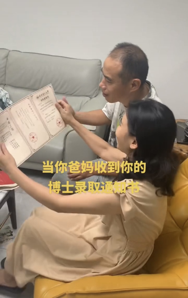 原来,视频中的夫妻是为了自己的孩子取得博士录取通知书而感到高兴。7月11日,潇湘晨报记者联系到视频拍摄者范同学,也就是录取通知书的获得者,他是一名1997年出生的小伙子,于今年7月成功上岸武汉理工大学经济学博士并取得录取通知书。当记者问及范同学为了申请博士做了哪些努力时,他表示:“每天会固定时间学习,暑假申请了留校没有回家,为了保持住更好的学习状态,有时候也会拒绝一些同学聚会。”
