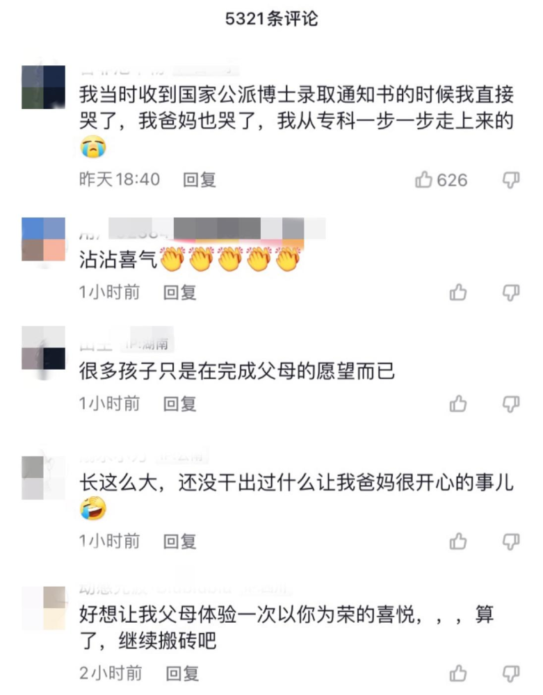 视频下方,网友们纷纷表示要“沾沾喜气”,一位IP地址显示为西班牙的网友评论:我当时收到国家公派博士录取通知书的时候直接哭了,我爸妈也哭了,我从专科一步一步走上来的。更多的网友则是对范先生表示祝贺。