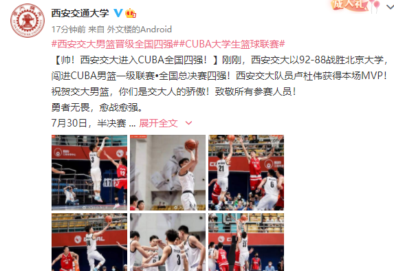 赛后西安交大官方社交媒体也送上祝贺,称:“祝贺!交大男篮,你们太棒了!”