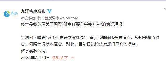 据“九江修水发布”微博7月30日通报消息,针对网民曝光“班主任要升学宴红包”一事,江西省九江市修水县教体局随即开展调查。经初步调查核实,网曝情况基本属实。对此,目前县纪检监察部门已介入调查。