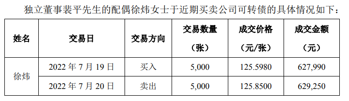 据上述监管函,裴平的配偶于7月19日买入“张行转债”5,000张,成交金额62.80万元;并于7月20日卖出“张行转债”5,000 张,成交金额 62.93 万元。前述交易买入和卖出时间间隔不足六个月,构成《证券法》第四十四条规定的短线交易。