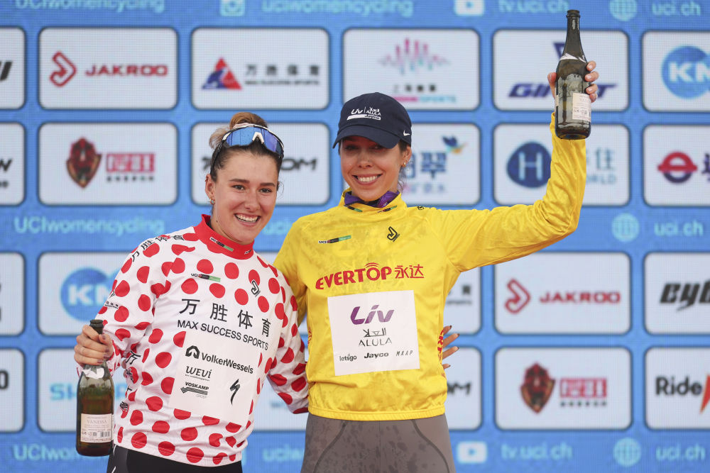10月14日,身着代表爬坡总积分第一名的圆点衫的安妮·克妮珍宝(左)和身着代表个人总成绩第一名的黄衫的贝克在颁奖仪式上庆祝。新华社记者 王翔 摄
